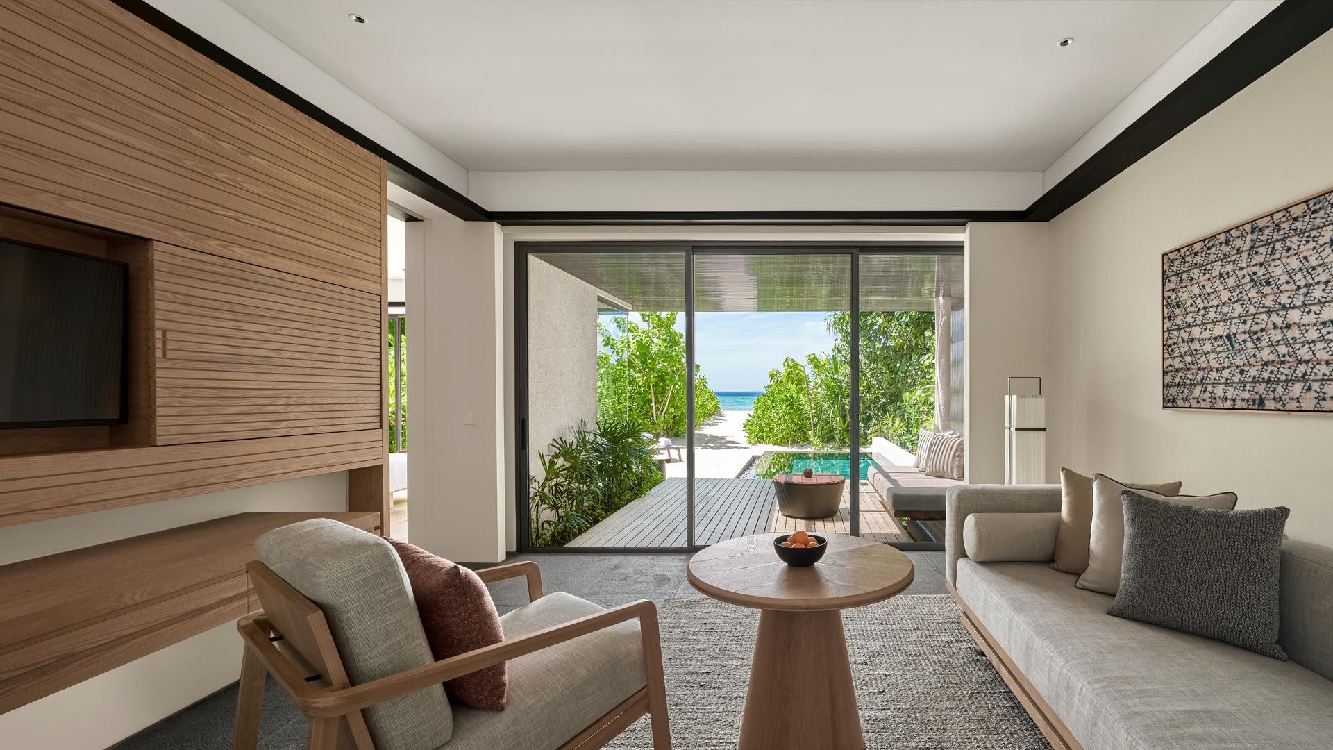 Beach Pool villa: >200 nm, napkelte felőli, tengerre néző, 1 külön hálószoba, külön nappali, zuhanyzó, fürdőkád, kültéri zuhanyzó, hajszárító, minibár térítés ellenében, széf, TV, WiFi, kávé/tea, terasz (bútorozott), közvetlen strandkapcsolat, saját medence, inasszolgálat