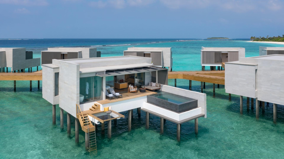 Óceán víz feletti medencés villa: 121-150 nm, vízi bungaló (cölöpökön a lagúna felett), lagúnára néző, nappali/hálószoba, zuhanyzó, fürdőkád, hajszárító, minibár térítés ellenében, széf, TV, WiFi, kávé/tea, terasz (bútorozott), közvetlen hozzáférés a strandhoz, saját medence, inasszolgálat
