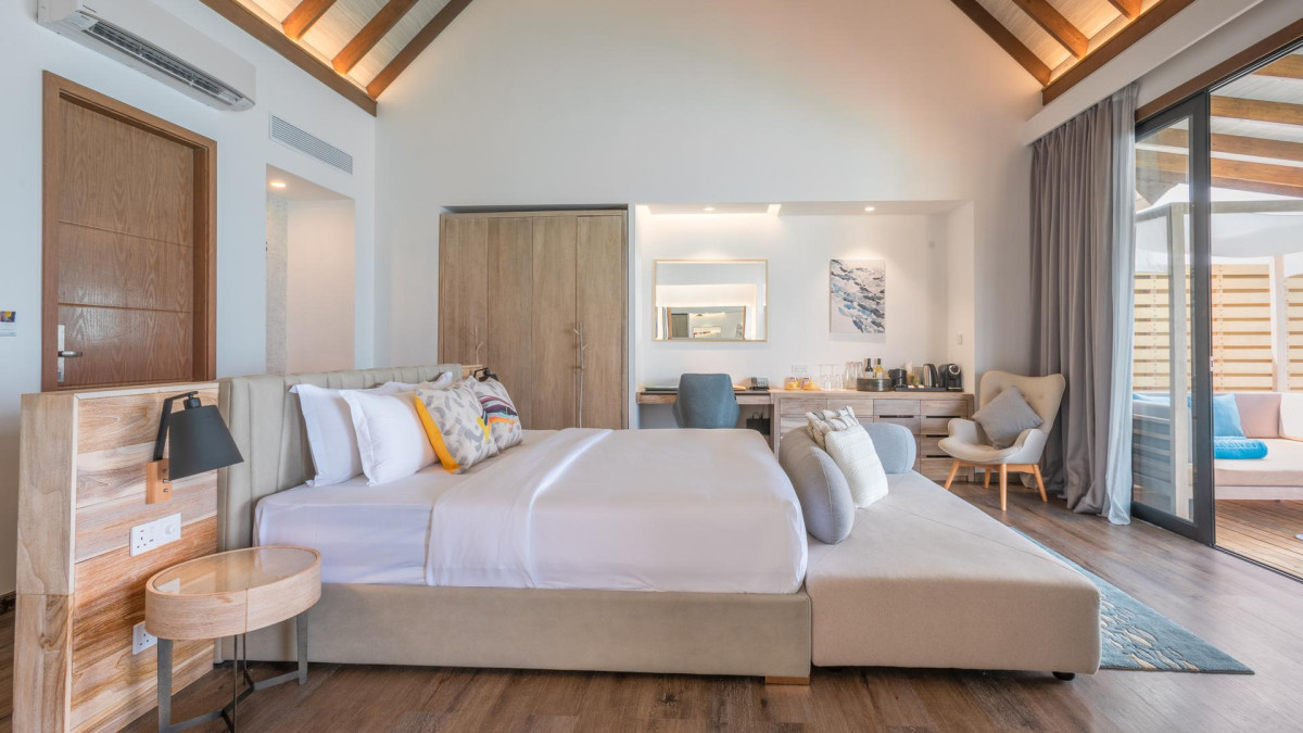 Jacuzzi vízi villa 91-100 nm, villa, különálló, vízi bungaló (cölöpökön a lagúna felett), kilátással a tengerre, fürdőkád, pezsgőfürdő, esőzuhany, WC, fürdőköpeny, hajszárító, fapadló, klíma, ventilátor, minibár térítés ellenében, széf, vasaló, TV, WiFi, vízforraló, kávé/tea, napozóterasz (bútorozva), közvetlen tengeri kijárat