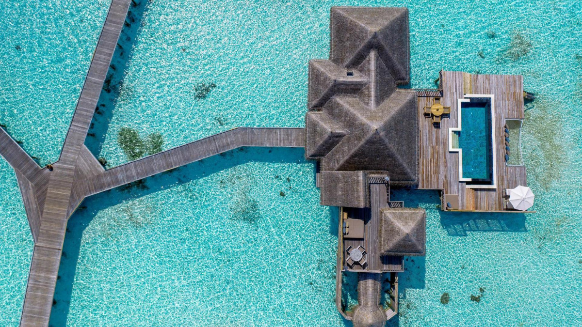 Villa Suite with Pool: kb. 264 nm + 19 nm-es medencével. Vízi bungaló, kilátással a tengerre, összes szobaszám ebben a szobatípusban: 1, elrendezés: nappali/hálószoba, kiságy: ingyenes, kérésre, szúnyogháló, légkondicionálás: ingyenes, január - december, egyénileg állítható, központilag vezérelhető, széf: ingyenes, mennyezeti ventilátor, kanapé, íróasztal, kávéfőző, kávé/teafőző, étkezőasztal, minibár: térítés ellenében, telefon, Internet: WLAN/WiFi: ingyenes térítés ellenében, TV: síkképernyős, a hálószobában, műholdas TV, Kábel TV, DVD lejátszó, CD lejátszó, iPod dokkoló, szobaszerviz: térítés ellenében, komornyik szolgáltatás: ingyenes, takarítás: naponta, ingyenes, külön zuhanyzó, fürdőkád, wc, üvegfallal elválasztott fürdőszoba, hajszárító, terasz: nyugágyakkal, ülőgarnitúrával