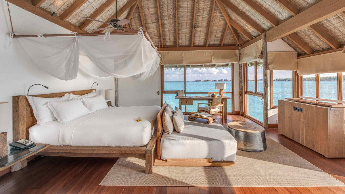 Villa Suites: kb 210 nm (kb. 116 nm lakóterület): A lakosztályt félig nyitott nappalival, stég köti össze a szigettel. Medencével is foglalható. Vízi bungaló, kilátással a tengerre, összes szobaszám ebben a szobatípusban: 1, elrendezés: nappali/hálószoba, kiságy: ingyenes, kérésre, szúnyogháló, légkondicionálás: ingyenes, január - december, egyénileg állítható, központilag vezérelhető, széf: ingyenes, mennyezeti ventilátor, kanapé, íróasztal, kávéfőző, kávé/teafőző, étkezőasztal, minibár: térítés ellenében, telefon, Internet: WLAN/WiFi: ingyenes térítés ellenében, TV: síkképernyős, a hálószobában, műholdas TV, Kábel TV, DVD lejátszó, CD lejátszó, iPod dokkoló, szobaszerviz: térítés ellenében, komornyik szolgáltatás: ingyenes, takarítás: naponta, ingyenes, külön zuhanyzó, fürdőkád, wc, üvegfallal elválasztott fürdőszoba, hajszárító, terasz: nyugágyakkal, ülőgarnitúrával