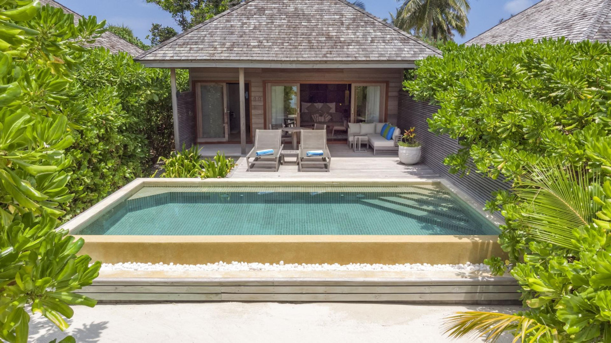 Beach Pool villa 101-120 nm, családi ház, tengerparti elhelyezkedés, tengerre néző, nappali/hálószoba, esőzuhany, wc, fürdőköpeny, papucs, hajszárító, fapadló, légkondi, ventilátor, minibár térítés ellenében, széf, TV, zenei rendszer , WiFi, kávéfőző, kávé/tea, terasz (bútorozott), saját medence