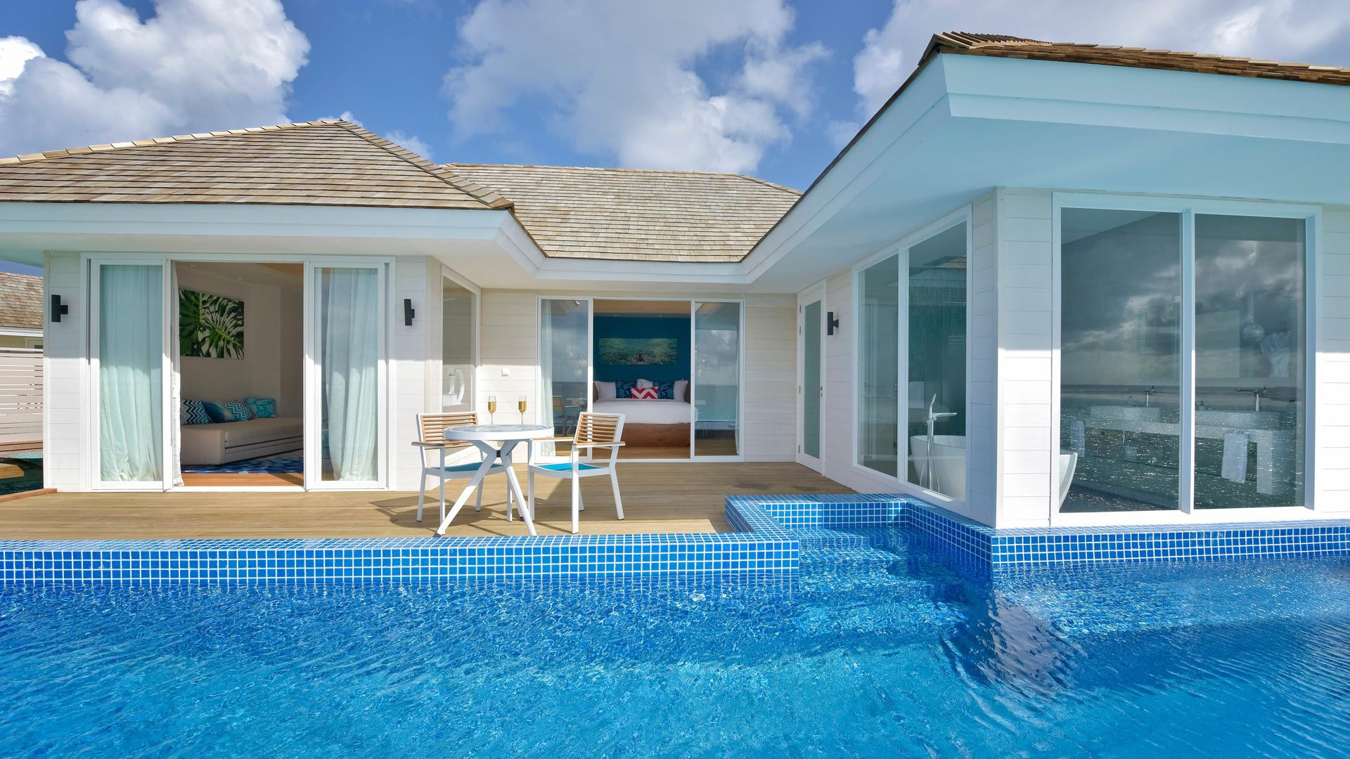Ocean Pool villa 81-90 nm, családi ház, cölöpökön a sziget mellett, félig a tengerparton, félig víz felett, tengerre néző, fürdőkád, esőzuhany, wc, hajszárító, klíma, ventilátor, minibár térítés ellenében, széf, tv , vízforraló, kávé/tea, terasz (bútorozott), saját medence