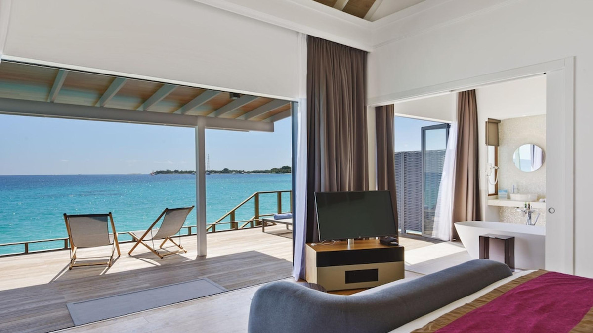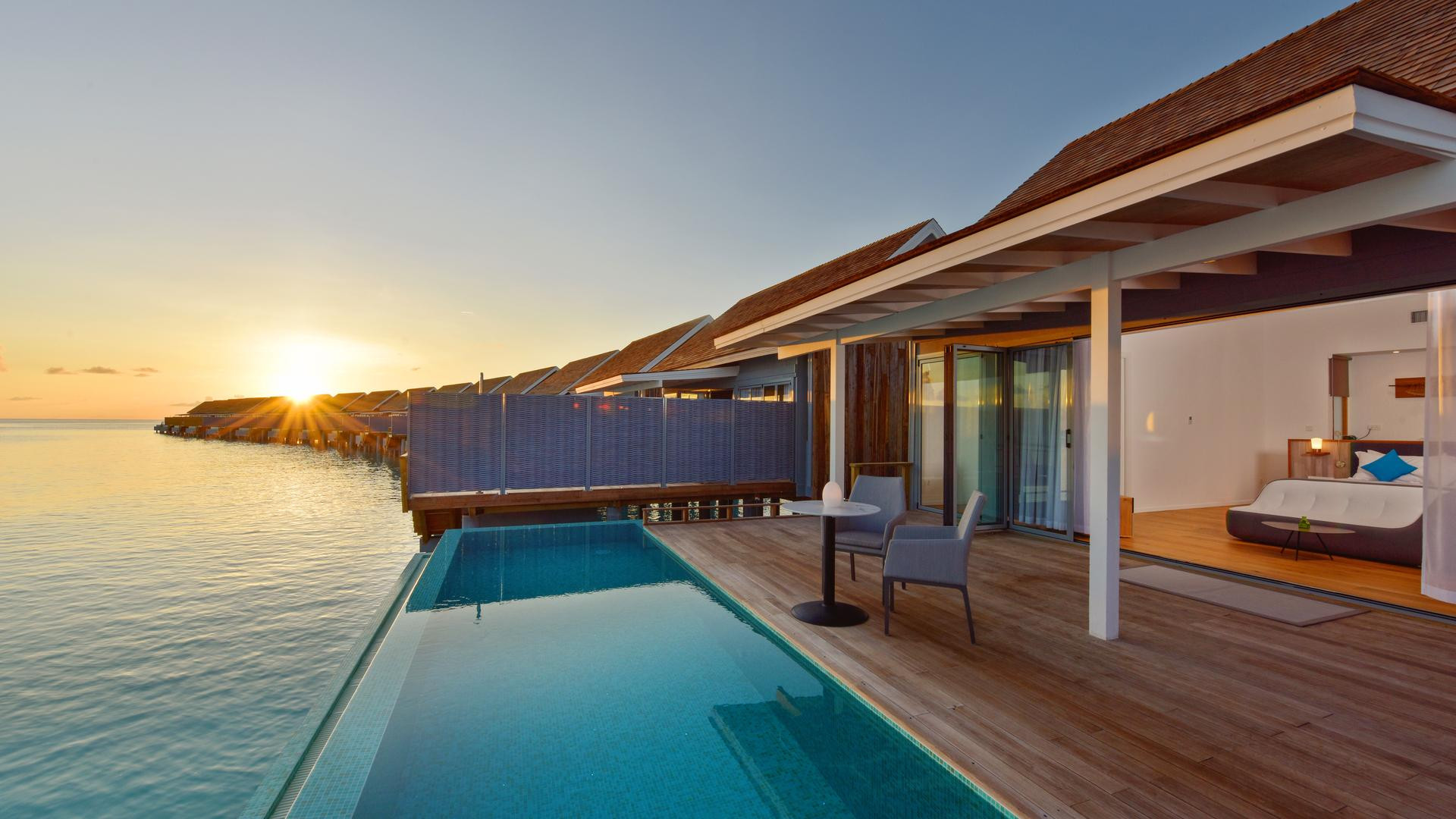 Water Villa medencével (BUM4), vízi bungaló, nemdohányzó szoba, kilátás a tengerre, kilátás a tengerre, kb. 142 m², utolsó teljes felújítás: 2016, a szobatípusok száma ebben a szobatípusban: 1, elosztása a következőképpen: kombinált nappali / hálószoba, 1 king-size ágy, Légkondicionálás: egyedileg állítható, padló: parketta, széf: ingyenes, mennyezeti ventilátor, kanapé, íróasztal, vasaló, vasalódeszka, Nespresso gép, kávé- / teafőző, vízforraló, minibár: egy díj, üdítők: térítés ellenében, az all inclusive ellátással, víz: térítés ellenében, az all inclusive ellátással együtt, alkoholos italok: térítés ellenében, snackek: térítés ellenében, minibár feltöltése, telefon, Internet: WLAN / WiFi: ingyenes térítés ellenében: TV: síkképernyős, Deutsche Welle, kábel-TV, iPod-dokkoló, takarítási szolgáltatás: naponta, ingyenes, külön zuhanyzó, kültéri zuhany, fürdőkád, WC, fürdőköpeny: ingyenes, üvegfalakkal elválasztott fürdőszoba, hajszárító, kozmetikai tükör, terasz: nyugágyakkal, nyugágyakkal, ülősarokkal, zuhanyzóval che, saját medencével