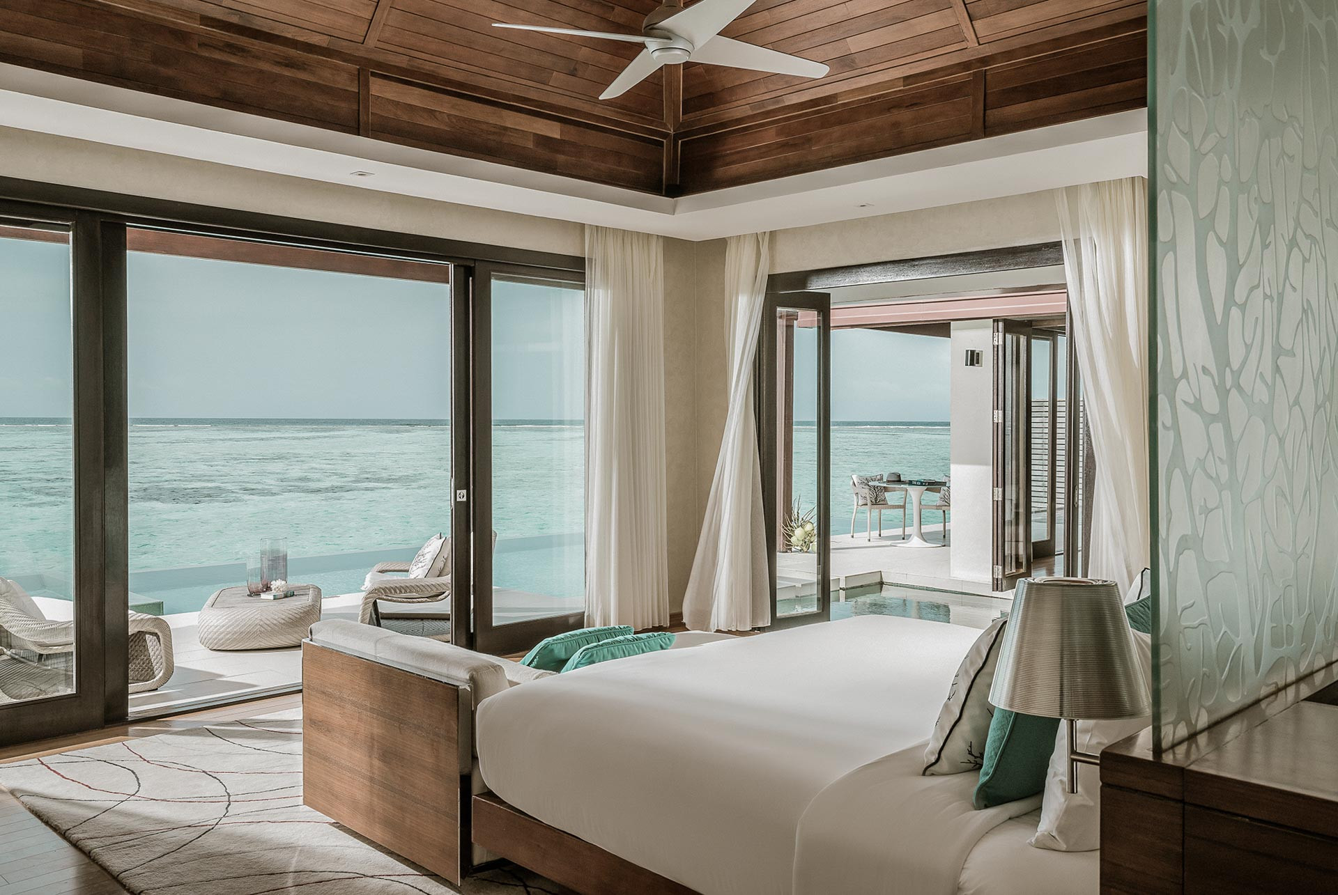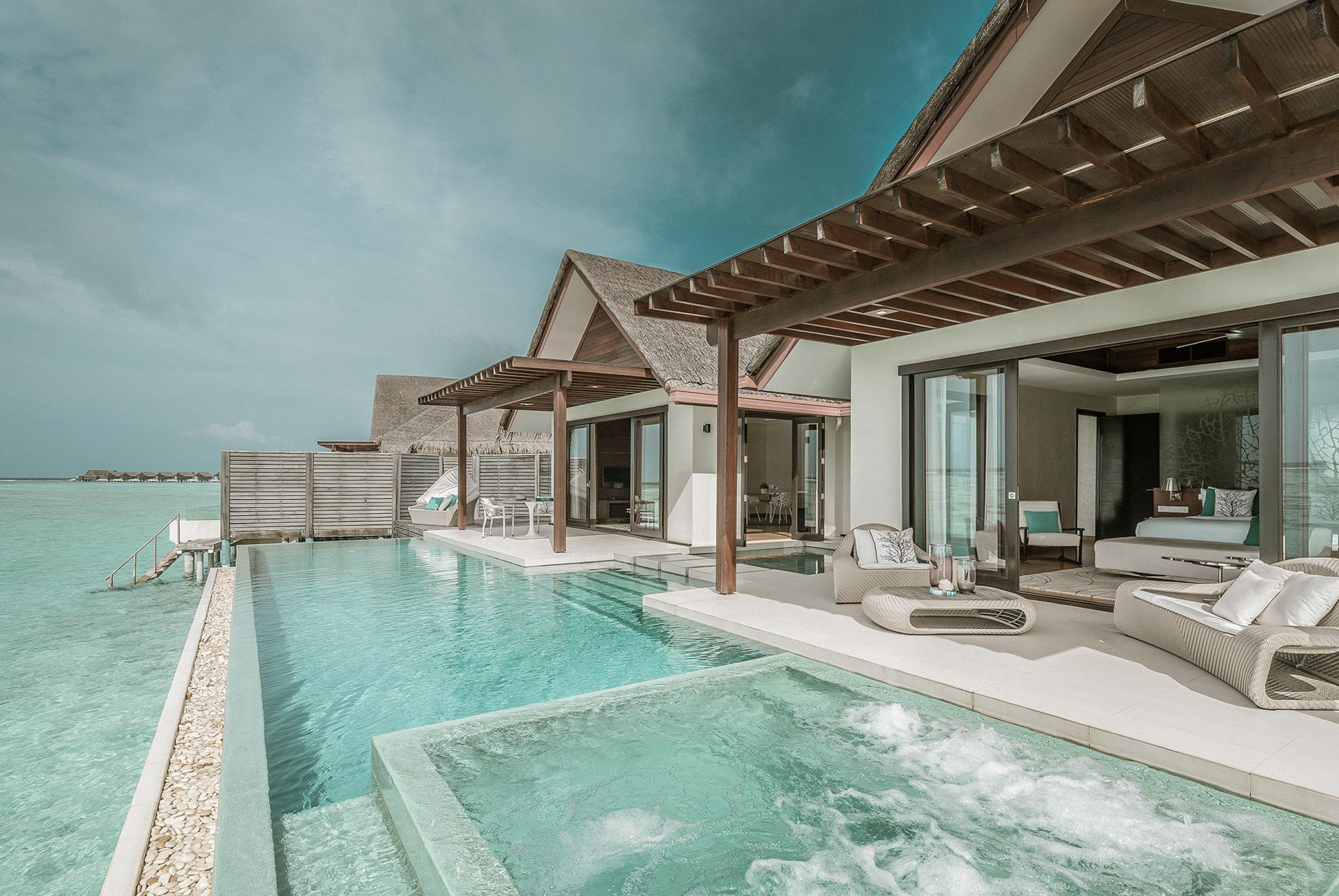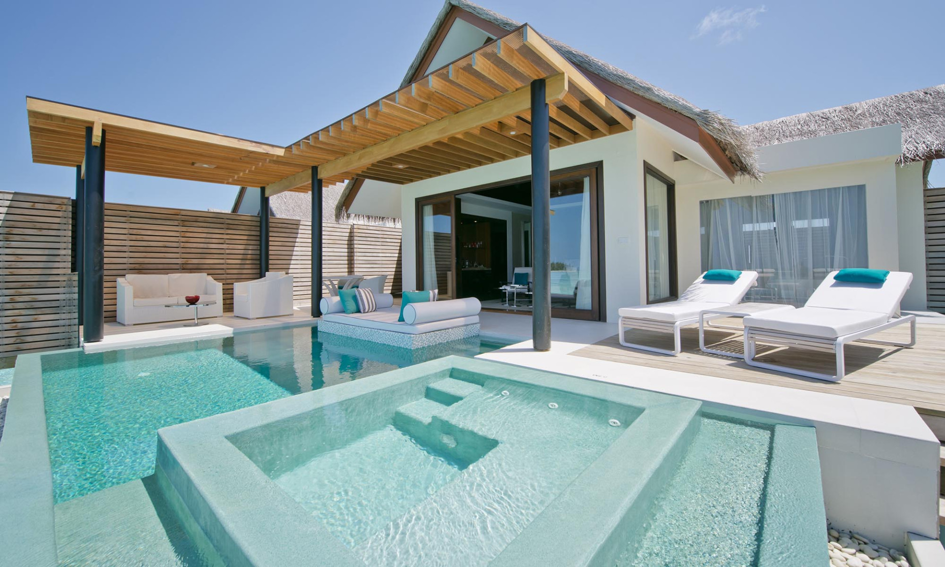 Deluxe Water Pool villa 151-200 nm, családi ház, vízi bungaló (cölöpökön a lagúna felett), tengerre néző, zuhanyzó, fürdőkád, WC, fürdőköpeny, papucs, hajszárító, légkondi, minibár térítés ellenében, széf, TV, DVD lejátszó, WiFi , vízforraló, kávéfőző, kávé/tea, terasz (bútorozott), közvetlen tengeri kijárat, saját medence, pezsgőfürdő