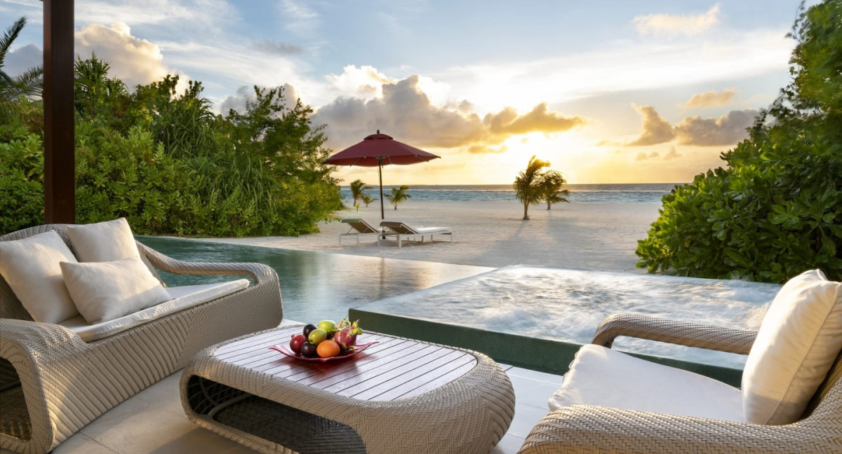 Beach Pool villa 151-200 nm, családi ház, tengerparti fekvésű, tengerre néző, félig nyitott fürdőszoba, zuhanyzó, kád, kinti zuhanyzó, wc, fürdőköpeny, papucs, hajszárító, klíma, minibár térítés ellenében, széf, TV, DVD lejátszó, WiFi, vízforraló, kávéfőző, kávé/tea, terasz (bútorozott), közvetlen strandhozzáférés, saját medence