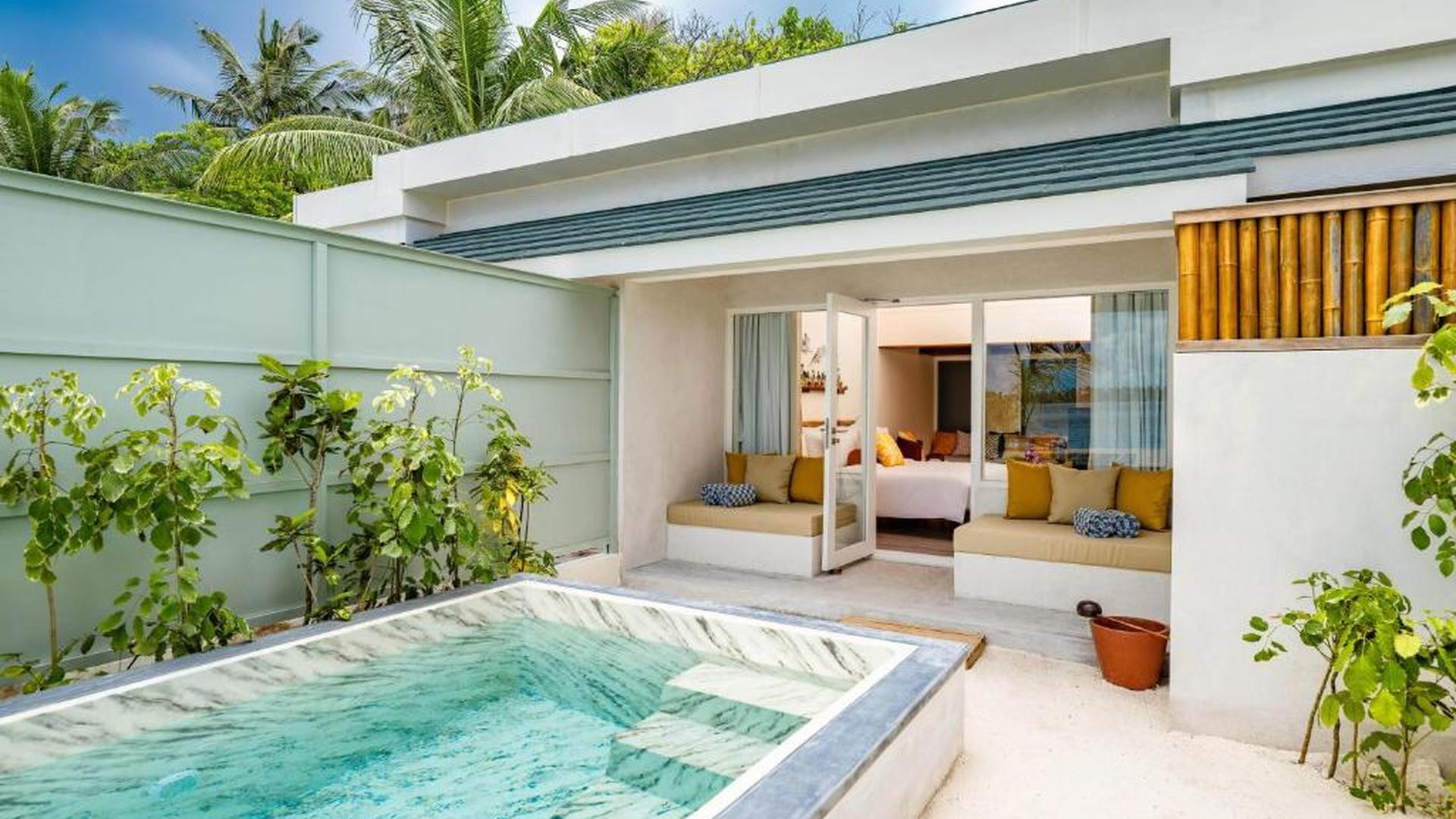 Napfelkelteparti vízparti villa medencével 81-90 m²-es, különálló villa, napfelkelte felőli oldalon, vízparti bungaló (cölöpökön a lagúna felett), tengerre néző, öltöző, zuhanyzó, WC, fürdőköpeny, hajszárító, légkondicionáló, ventilátor, minibár (naponta feltöltve), üdítők, ásványvíz, széf, TV, Wi-Fi, vízforraló, kávé/tea, bútorozott terasz, közvetlen tengerparti kijárat, saját medence