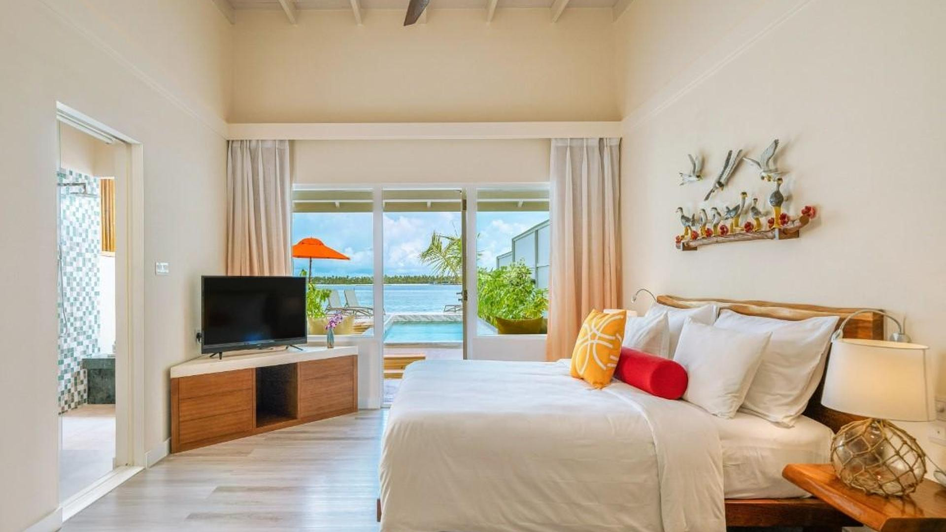 Naplemente vízparti villa medencével 81-90 m²-es, különálló villa, naplemente felőli oldalon, vízparti bungaló (cölöpökön a lagúna felett), tengerre néző, öltöző, zuhanyzó, WC, fürdőköpeny, hajszárító, légkondicionáló, ventilátor, minibár (naponta feltöltve), üdítők, ásványvíz, széf, TV, Wi-Fi, vízforraló, kávé/tea, bútorozott terasz, közvetlen tengerparti kijárat, saját medence