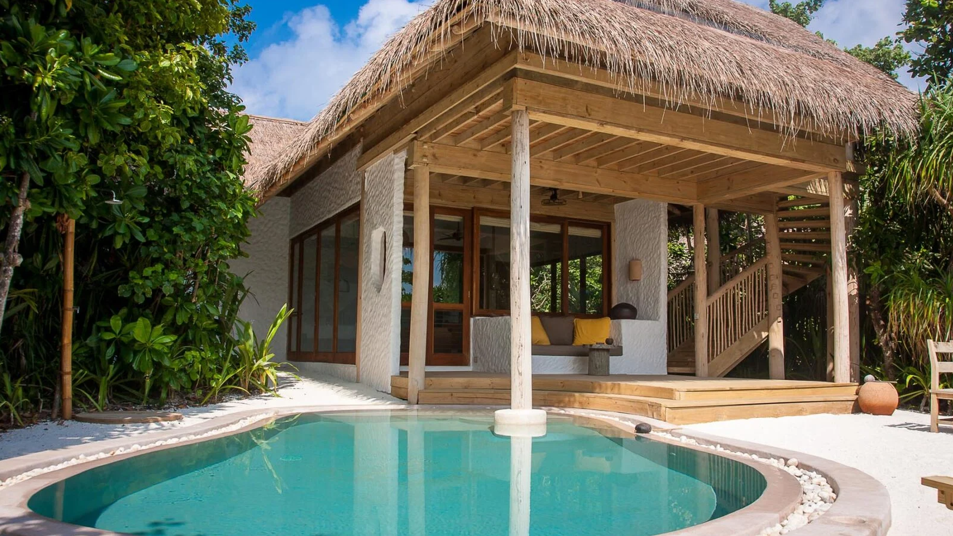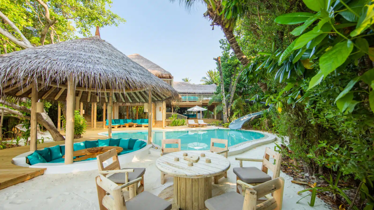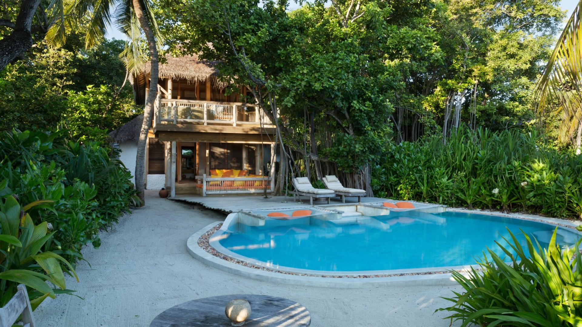 Soneva Fushi Villa Suite medencével (ebből 7 privát medencével rendelkezik): kb. 594 nm (kb. 96 nm lakrész): külön nappalival és hálószobával és medencével.