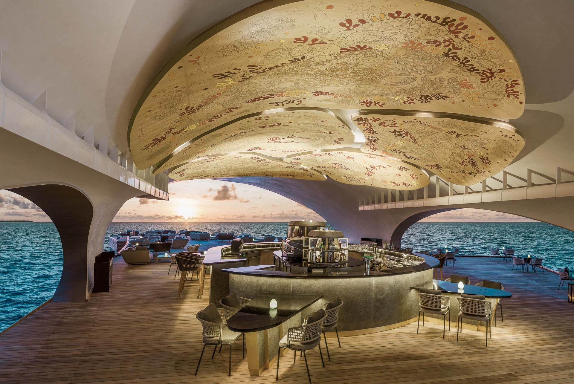 A futurisztikus tengeri ihletésű „Whale Bar” azaz Bálna Bár jellegzetes alakja a fenséges cetcápát szimbolizálja. Ez az extravagáns tervezésű, lagúna fölé épült menedékhely világos-tölgy falfestménnyel díszített belső terekkel, lágy megvilágítással kínál egyedülálló atmoszférát tengerre néző kilátással. A Maldív-szigetek élénk tengeri életének ünnepét szimbolizáló, hagyományos St. Regis falfestmény alatt található a bár fő területe, amelyet a tengeri teknős formája ihletett. A megkülönböztető formájú bár közvetlenül a szabadtéri víz feletti teraszra nyílik, ahol plüss kanapék és karosszékek invitálják a vendégeket csábító naplemente panorámára, kilátással az óceánra és a Vommuli-sziget makulátlan zátonyára. A „Whale Bar” fenséges falatokat, friss helyi tenger gyümölcseit, izgalmas koktélokat és válogatott borokat kínál.The Whale Bar-ban, grillezés a naplementében koktélokkal és tapas-al.