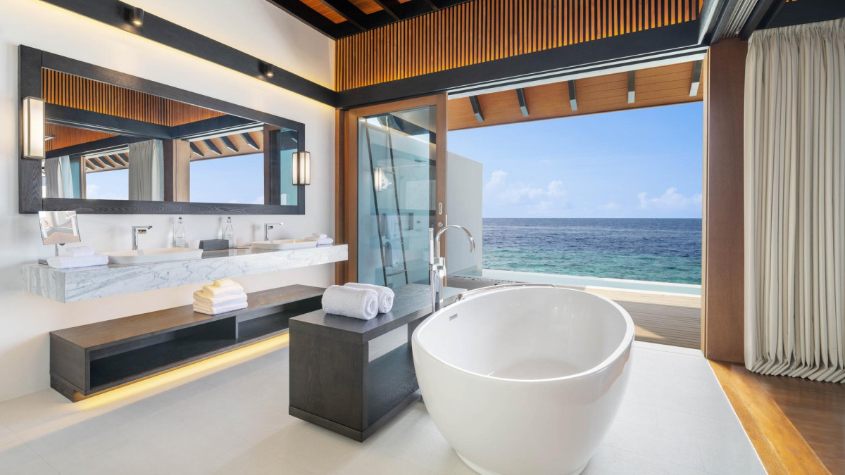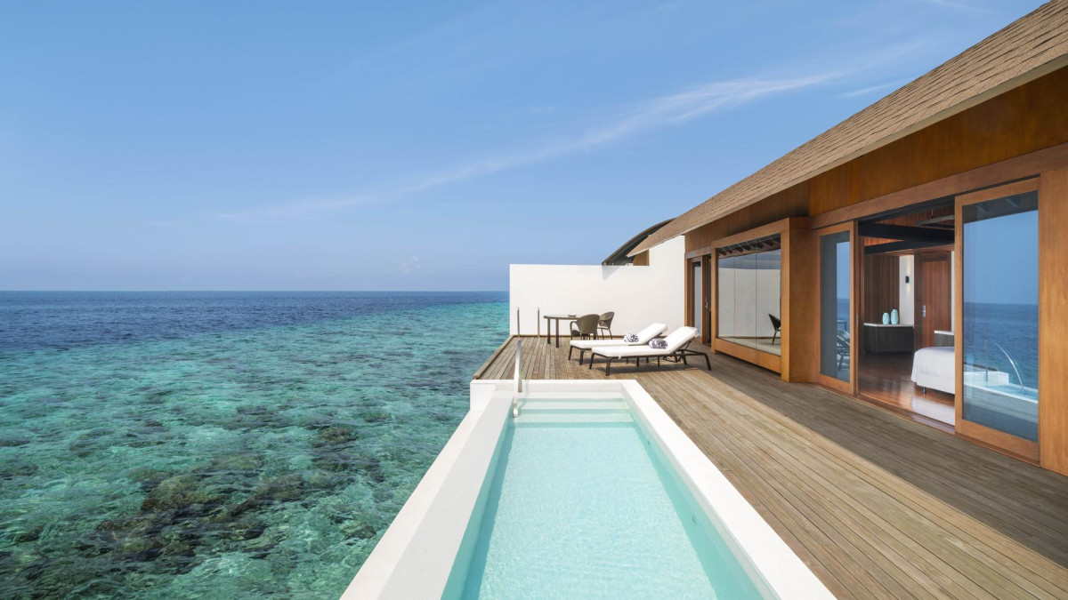 A Overwater Villas Pool padlóba ágyazott üvegablakkal rendelkezik a víz alatti világ megfigyelésére.