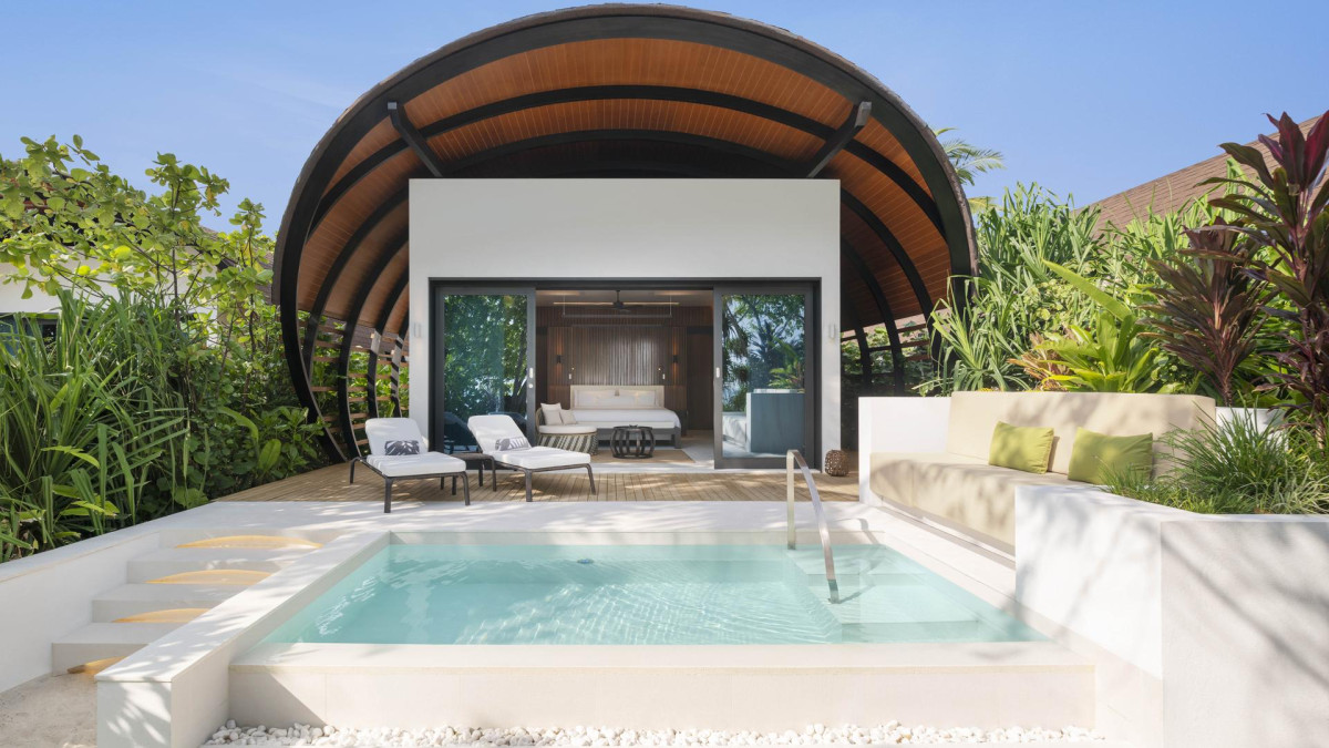 Beach Villa Pool 121-150 nm, egyágyas ház, tengerre néző, franciaágy (king size), zuhanyzó, fürdőkád, kültéri zuhanyzó, wc, hajszárító, légkondi, ventilátor, minibár térítés ellenében, széf, TV, WiFi, vízforraló, kávéfőző, kávé/tea, terasz (bútorozott), közvetlen strandkapcsolat, saját medence