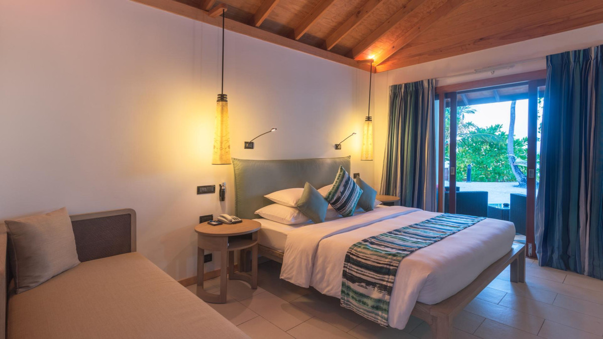 Szomszédos Beach Villa, villa, tengerre néző, tengerre néző, lagúnára néző, kb. 55 m², összesen szobaszám ebben a szobatípusban: 1, elrendezése a következő: kombinált nappali/hálószoba, kiságy: nincs díj, kérésre szükséges, előjegyzés nem szükséges , klíma: ingyenes, egyénileg szabályozható, hideg, padló: parketta, széf: ingyenes, mennyezeti ventilátor, kanapé, kávé/teafőző, vízforraló, minibár: térítés ellenében, üdítők: a térítés ellenében, víz: térítés ellenében, alkoholos italok: térítés ellenében, harapnivalók: térítés ellenében, minibár feltöltése: naponta, telefon, Internet: WLAN/WiFi: térítésmentes, TV: a hálószobában, kábeltévé, DVD lejátszó , CD lejátszó, szobaszerviz: térítés ellenében, takarítás: ingyenes, zuhanyzó , esőzuhany, WC, fürdőköpeny: ingyenes, hajszárító, terasz: nyugágyakkal, ülőgarnitúrával, veranda