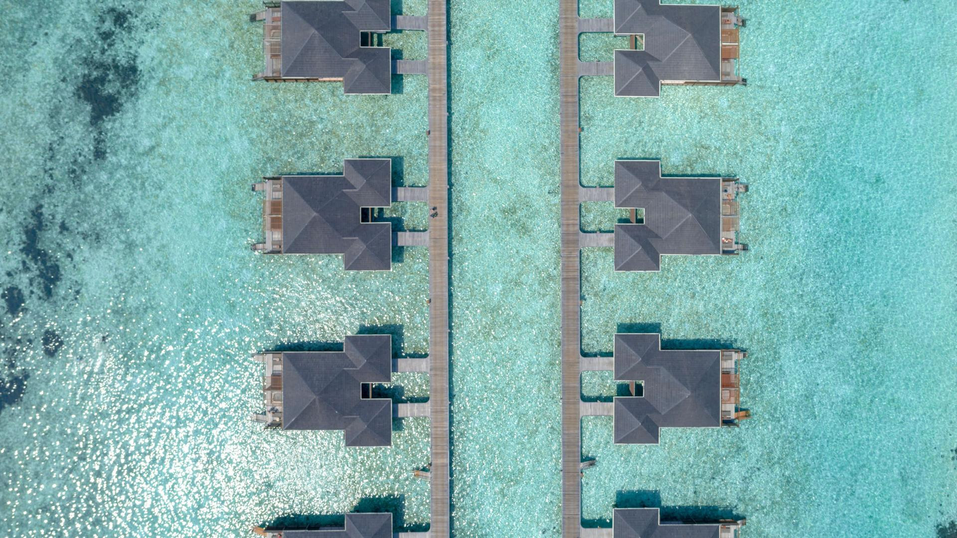 Vízi villa 71-80 nm-es, ikerház, vízi bungaló (cölöpökön a lagúnán), kilátással a tengerre, zuhanyzó, kültéri fürdőkád, wc, fürdőköpeny, hajszárító, légkondi, ventilátor, minibár térítés ellenében, széf, TV, WLAN , vízforraló, kávé/tea, terasz (bútorozva), közvetlen kijárat a tengerhez
