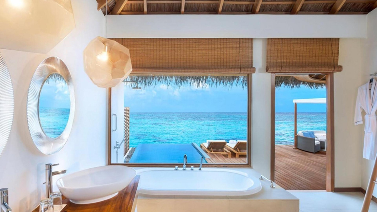 Extreme WOW Ocean Haven két hálószobás villa, vízi bungaló, nemdohányzó szoba, tengerre néző, tengerre néző, kb. 492 m², összesen szobaszám ebben a szobatípusban: 2, elrendezése a következő: 2 hálószoba, 2 egyágyas ágyak, 1 king-size ágy, babaágy: térítés ellenében, kérés és foglalás szükséges, klíma: egyénileg állítható, padló: járólap, széf: ingyenes, mennyezeti ventilátor, pihenősarok, kanapé, íróasztal, vasaló, vasalódeszka , konyha, főzőfülke, hűtőszekrény: ingyenes, Nespresso gép, kávé/teafőző, Minibár: térítés ellenében, üdítők: ingyenes, víz: ingyenes, alkoholos italok: térítés ellenében, harapnivalók: térítés ellenében , telefon, Internet: WLAN/WiFi: ingyenes, TV: síkképernyős, a nappaliban, műholdas TV, DVD lejátszó, CD lejátszó, iPod dokkoló, szobaszerviz: térítés ellenében, zuhanyzó, külön zuhanyzó, fürdőkád, pezsgőfürdő, külön WC, fürdőköpeny: ingyenes, papucs: ingyenes, 2 fürdőszoba, hajszárító, kozmetikai tükör, terasz: nyugágyakkal, ülőgarnitúrával nity, zuhanyzóval, pezsgőfürdővel, saját medencével